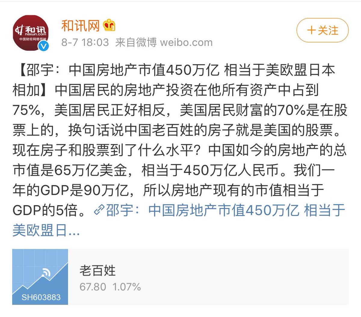 - 严重警告!中国房价暴跌在即!8月7日,在“2019博鳌房地产论坛”,东方证券首席经济学家邵宇表示「现在中国的房子总市值相当于美国+欧盟+日本之和。中国房地产总市值是450万亿人民币。我们一年GDP是90万亿,房地产市值相当于GDP的5倍。1990年日本泡沫经济崩溃前夕,它的房地产总市值相当于GDP的3.9倍。」